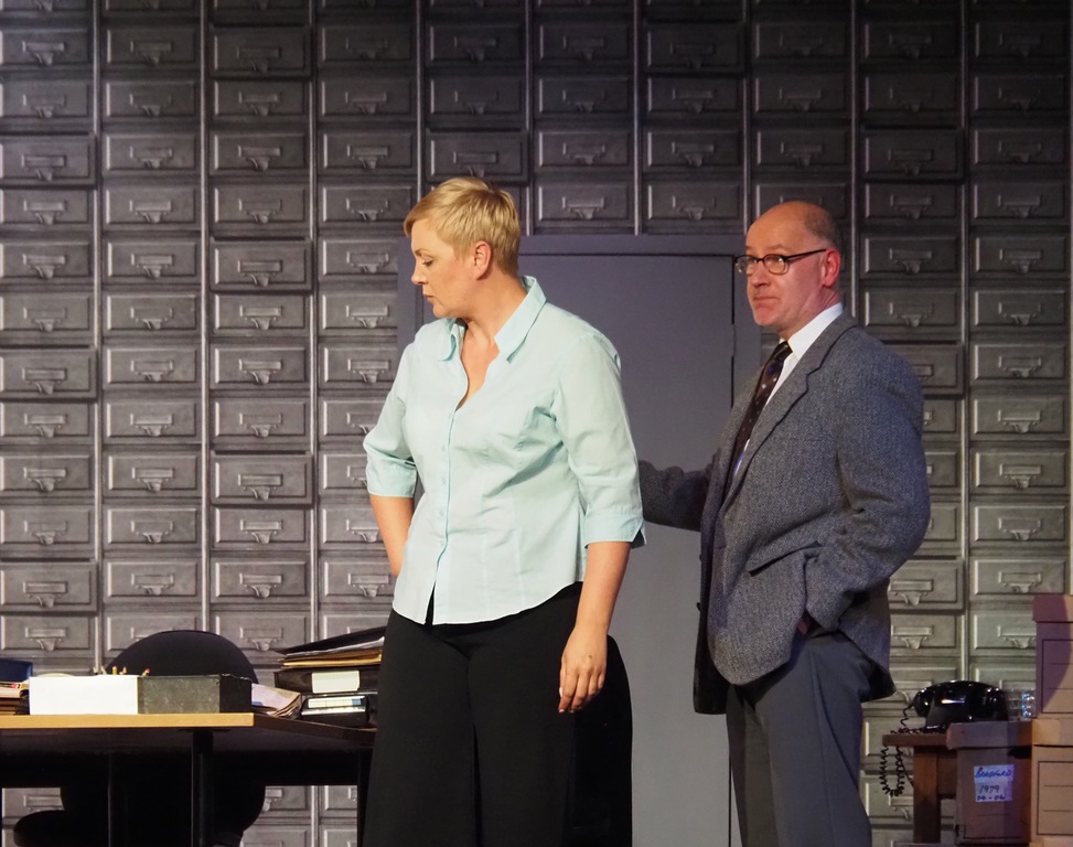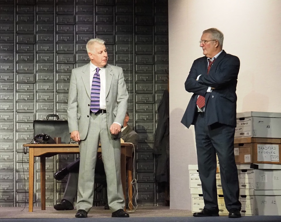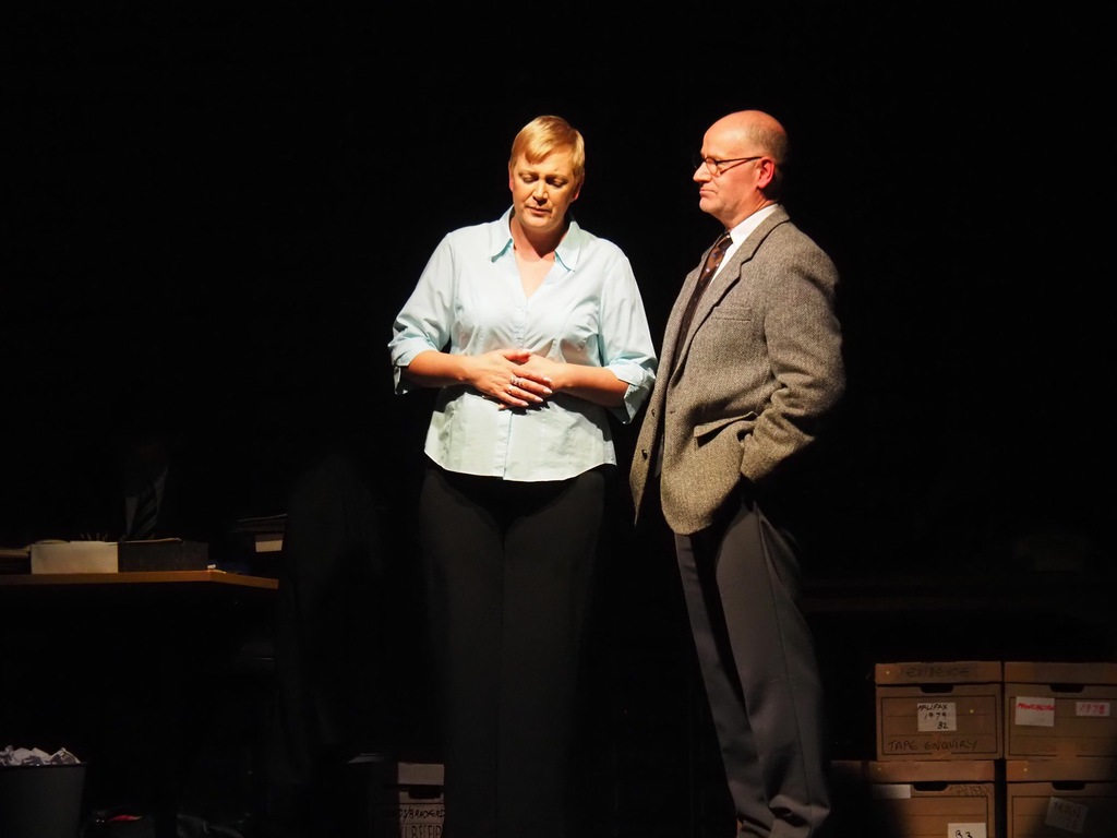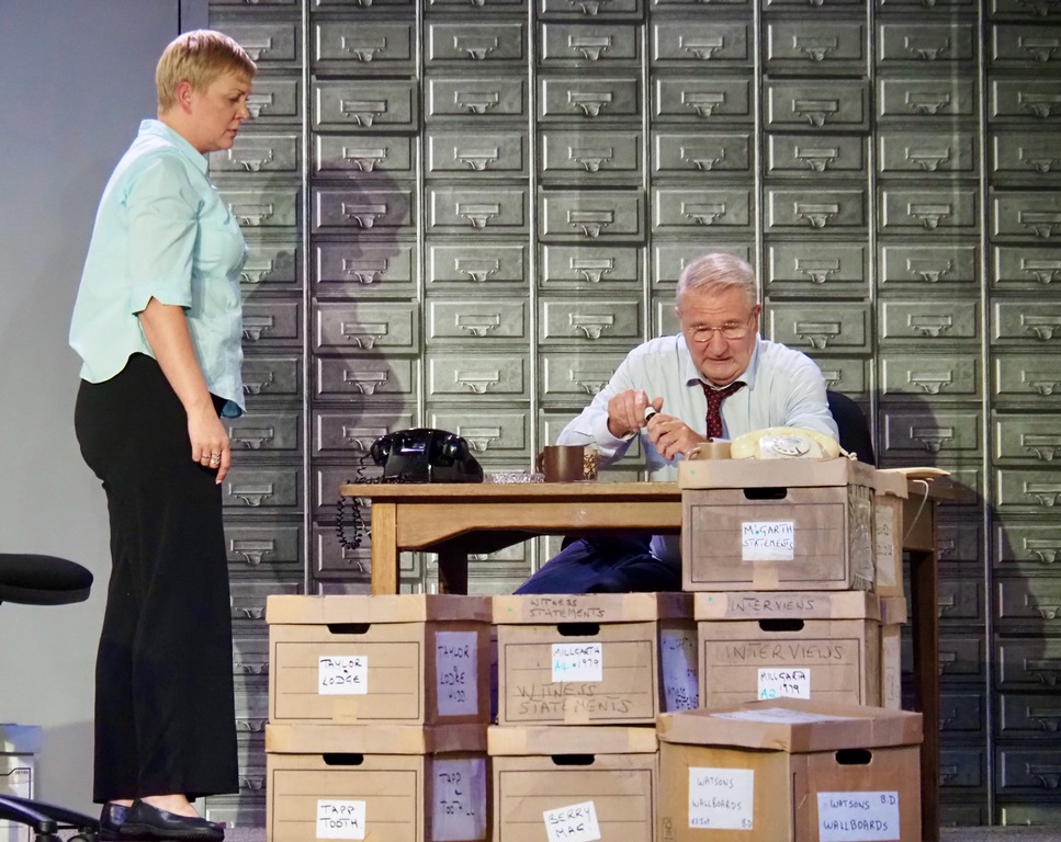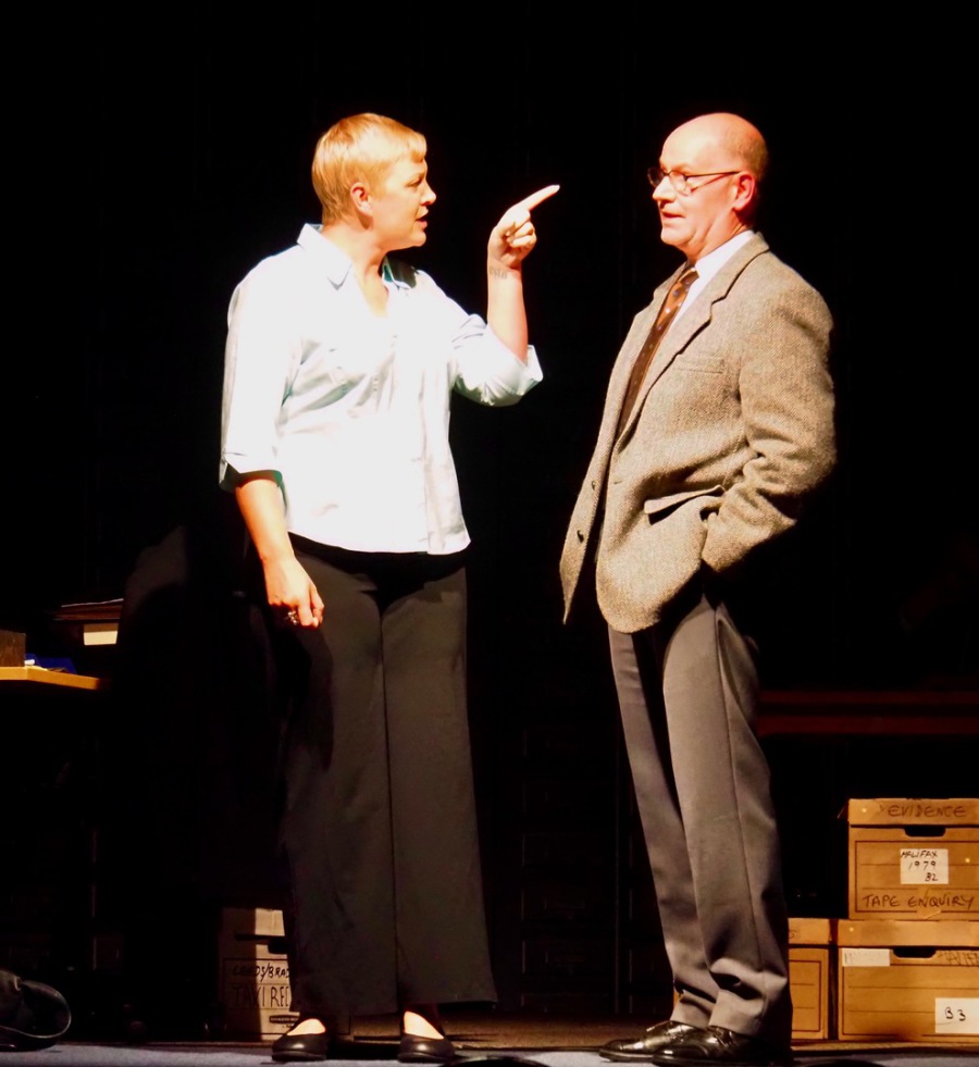 As the play evolved, we heard the so-called “Ripper Tapes”, still guaranteed to shock nearly fifty years on. We heard the letters supposedly sent by the Ripper, red herrings which delayed the investigation greatly, and all the time we felt the frustration of Megan Winterburn and Andy Laptew, as they could see a different side to it, which was brushed aside by the senior officers. And all the time the boxes of files piled up, threatening to take over the office. There was quite a bit of humour too, which was appreciated by the audience, as the laughter rang out loud several times during the play.